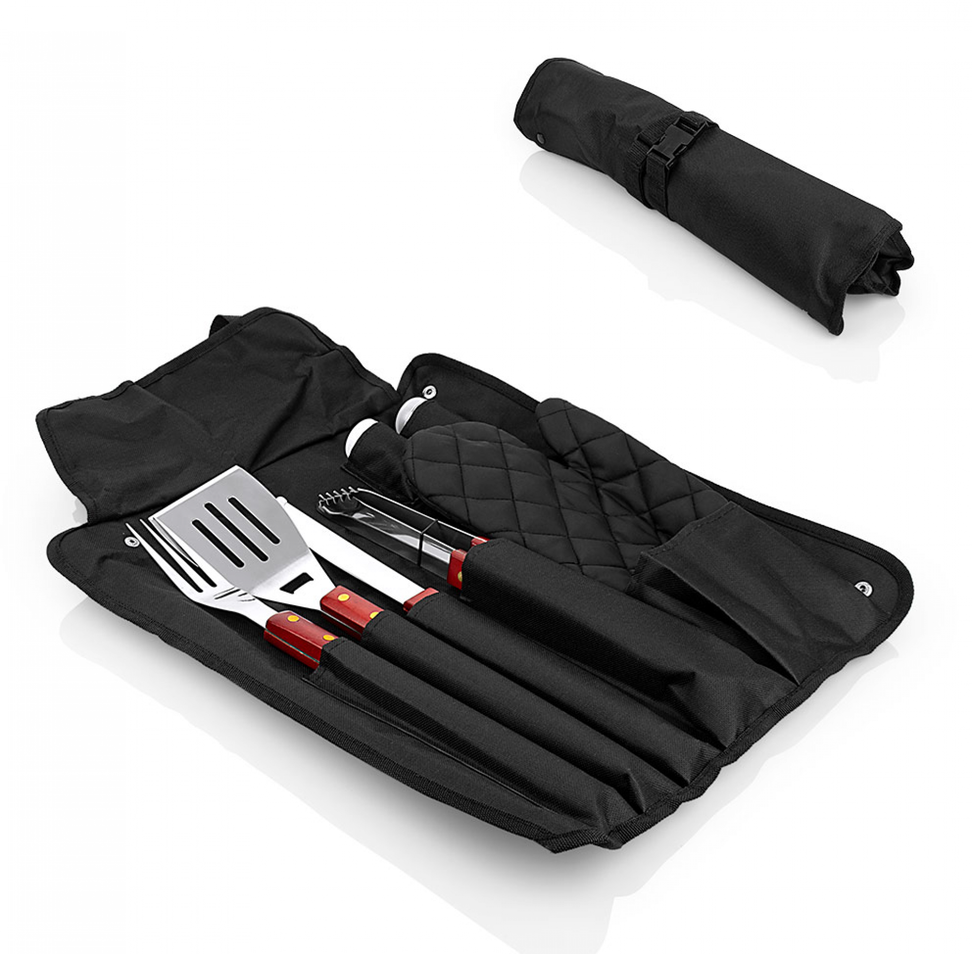 Set de BBQ compuesto por el estuche delantal con broches, correa ajustable y 7 utensilios
