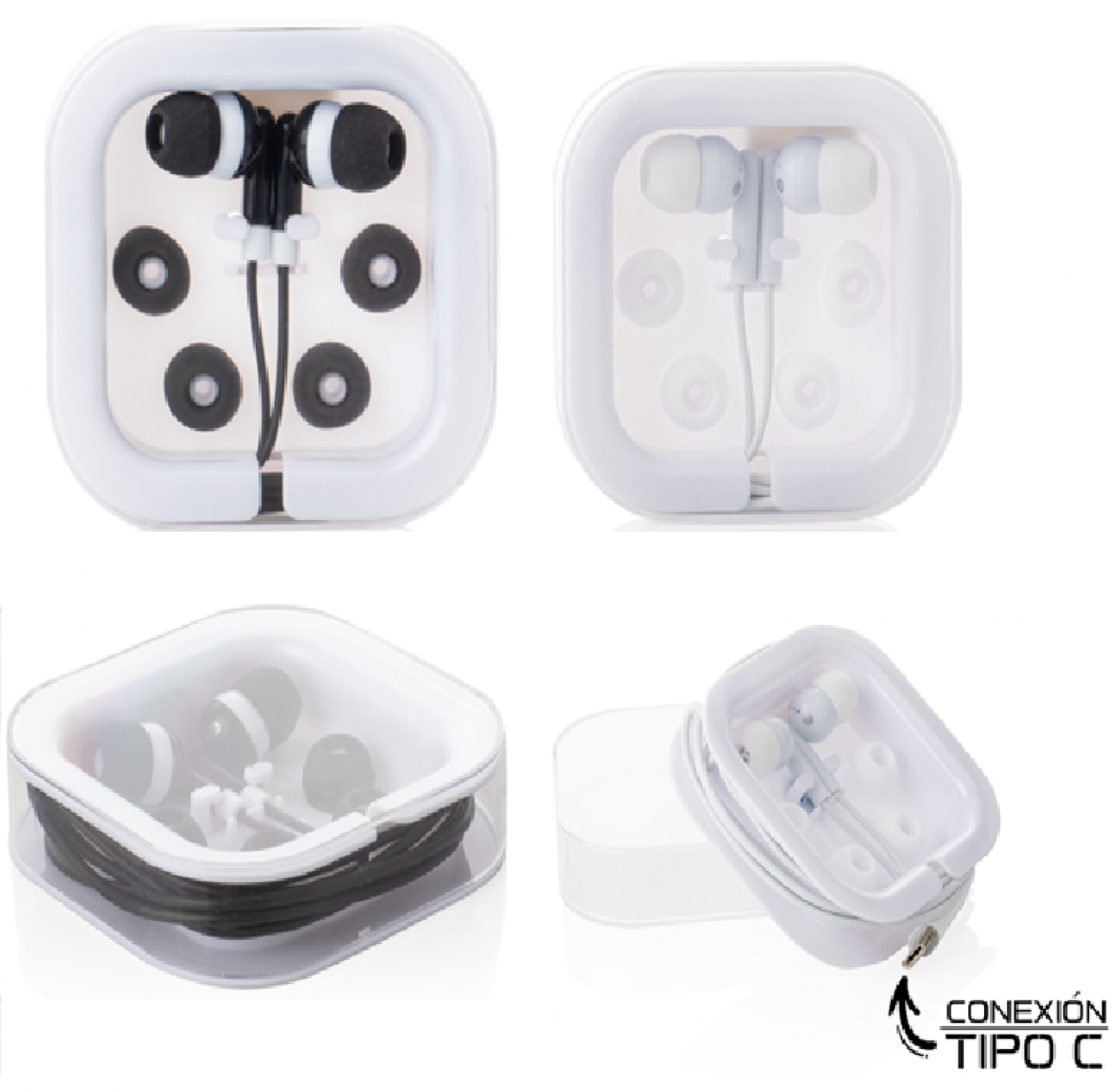 Audífonos con entrada tipo C en estuche cuadrado transparente a presión.