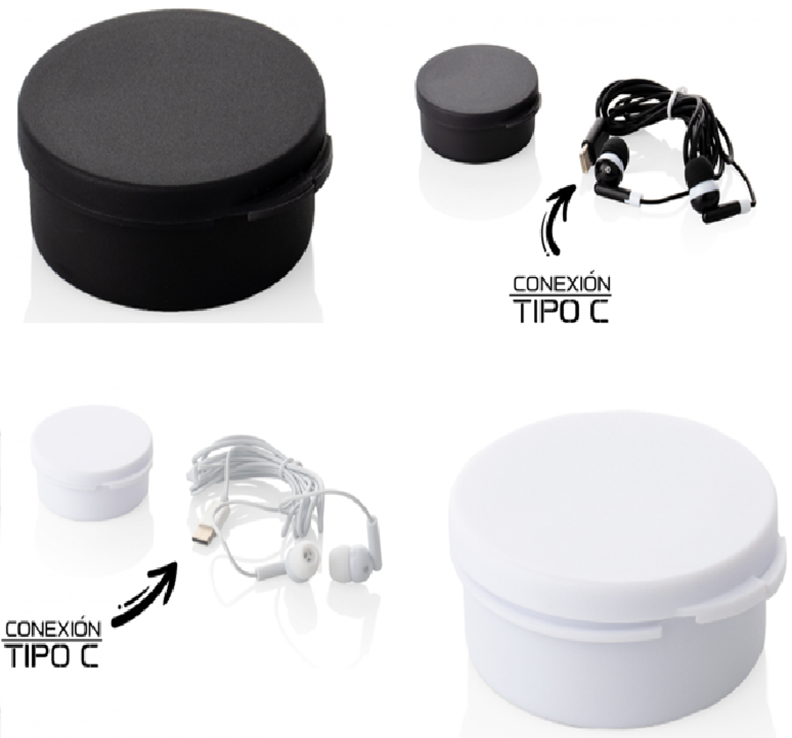 Audífonos con entrada tipo C en estuche circular con tapa a presión.