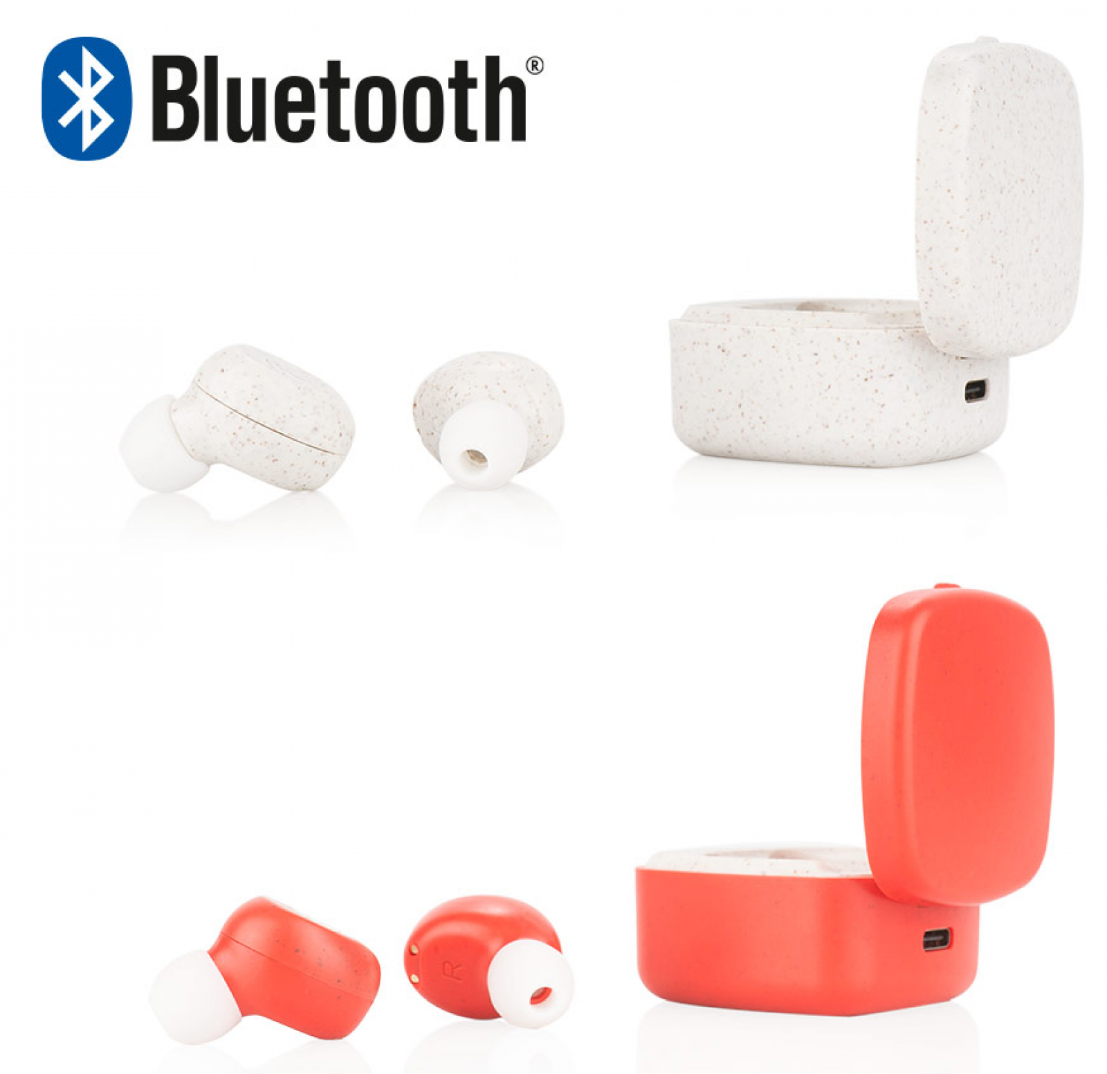 Audífonos Bluetooth 5.1 fabricados con paja de trigo, un material sostenible y amigable con el medio ambiente. Incluyen estuche de carga con batería de polímero de litio de 200 mAh. Ofrecen hasta 4 horas de uso continuo y función de manos libres. Voltaje de carga: 5 V. Diseño compacto y ecológico, ideal para el día a día.