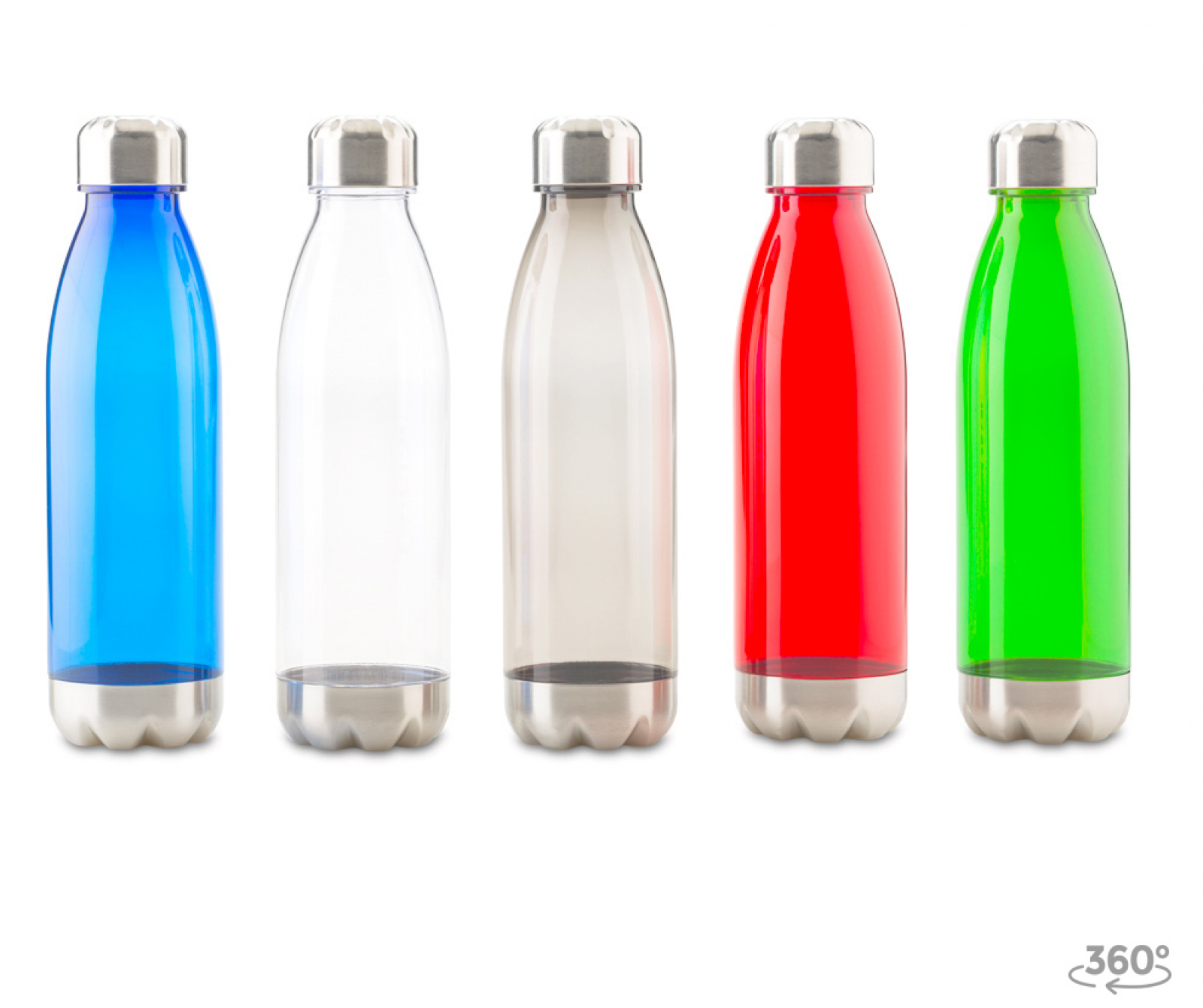Botilito plástico en Acrilonitrilo estireno (AS) con tapa y base con exterior metálico. Libre de BPA (bisphenol-A).