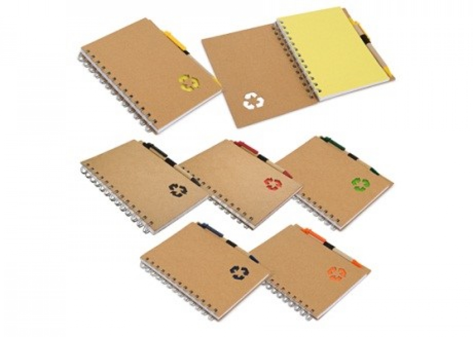 Libreta con tapa de cartón y argollado metálico doble O con troquel en forma ecológico. Bolígrafo ecológico incluido de color similar. Con porta bolígrafo. Tamaño aproximado: A5. 80 hojas rayadas