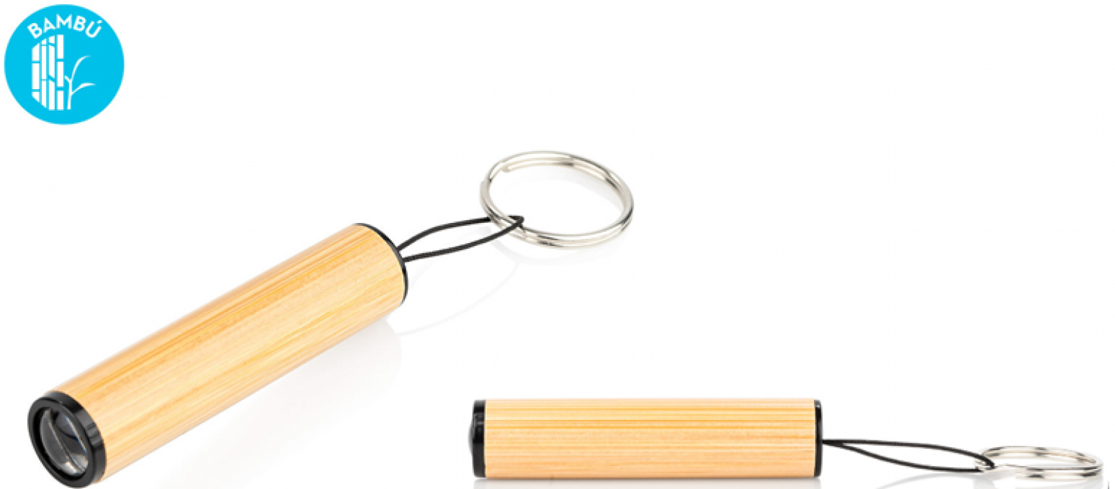 Mini linterna LED con revestimiento de bambú, pequeña y fácil de usar. Incluye aro para llaves.