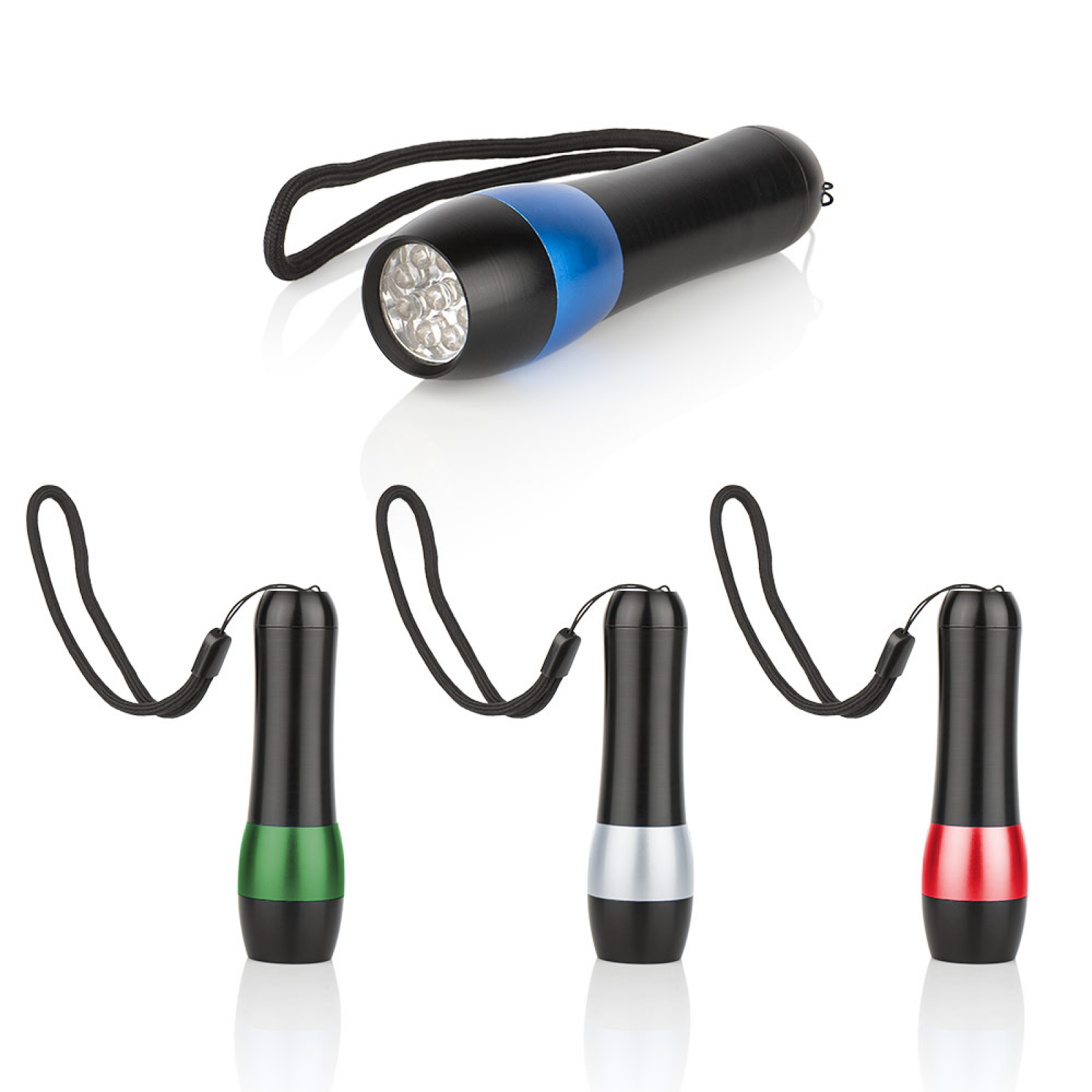 Linterna de aluminio con 9 LEDs. Requiere 3 pilas AAA (no incluidas). Correa negra para transportar fácilmente.