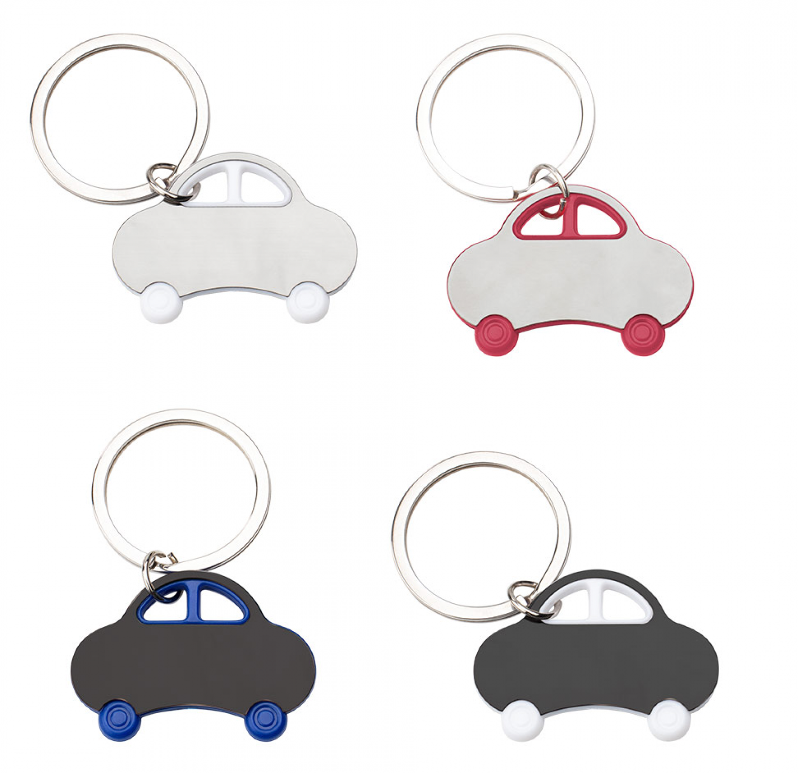Llavero metálico con forma de automóvil. Diseño moderno en acabado bicolor con detalles plásticos en contraste. Incluye anillo metálico resistente para mayor durabilidad.