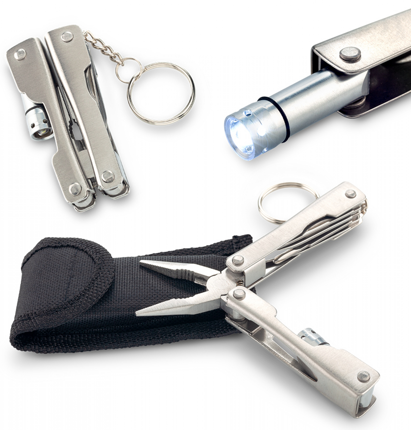 Mini set de herramientas multifuncional con luz LED. Incluye argolla tipo llavero y estuche para cargar. Medidas Cerrado: 7 cm x 3 cm Marca: 2 cm / Láser
