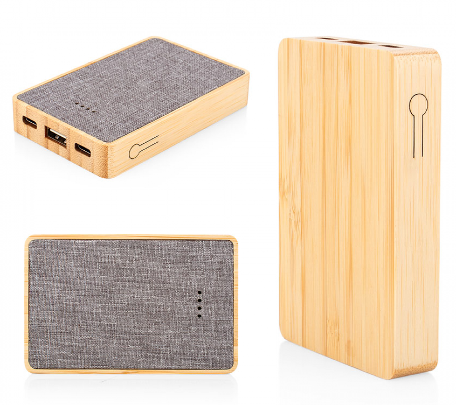 Multicargador fabricado con RPET y bambú con entrada Tipo C y salidas Tipo C y USB. Diseño innovador y atractivo.