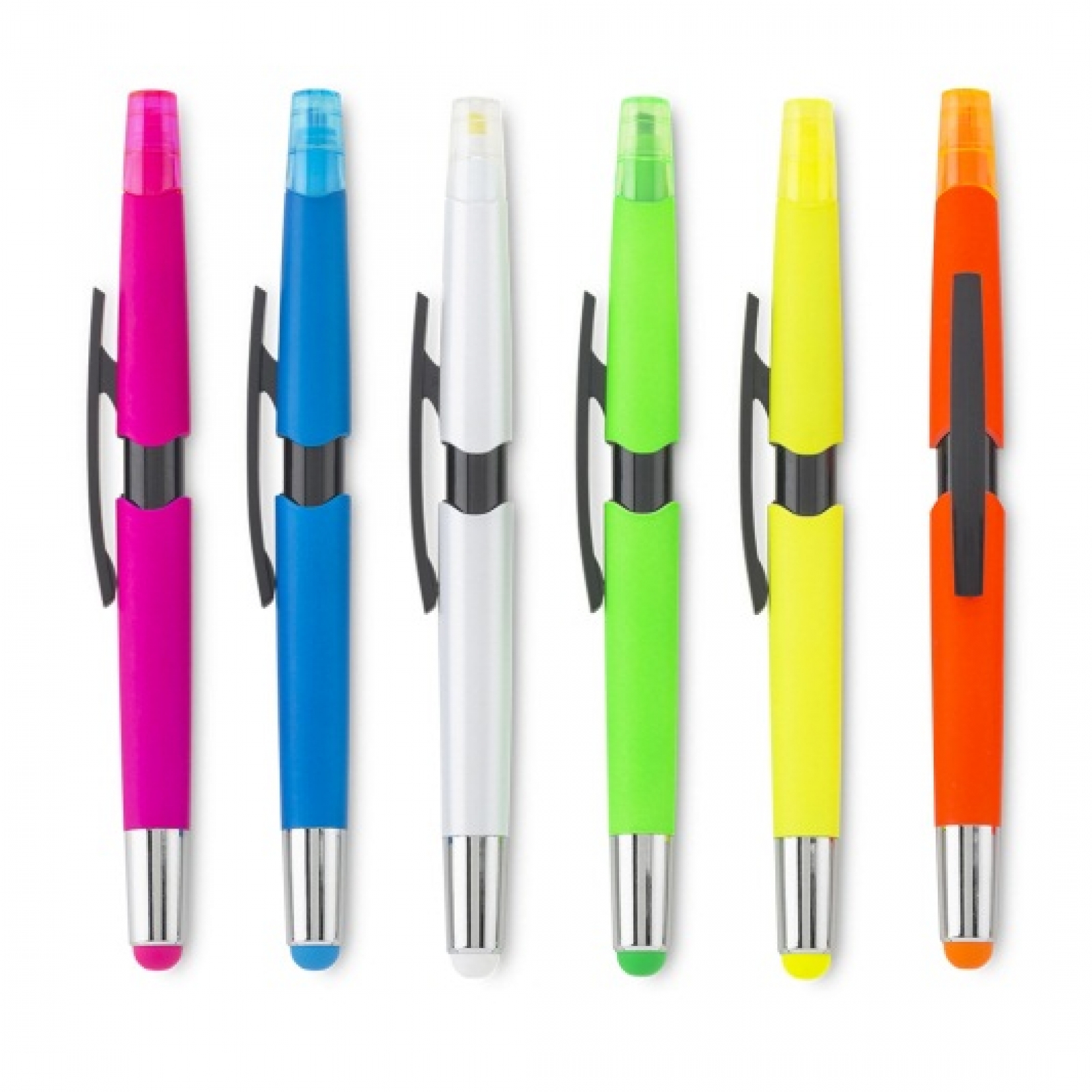 Bolígrafo plástico. Con stylus en la punta y mecanismo push. Resaltador de tinta