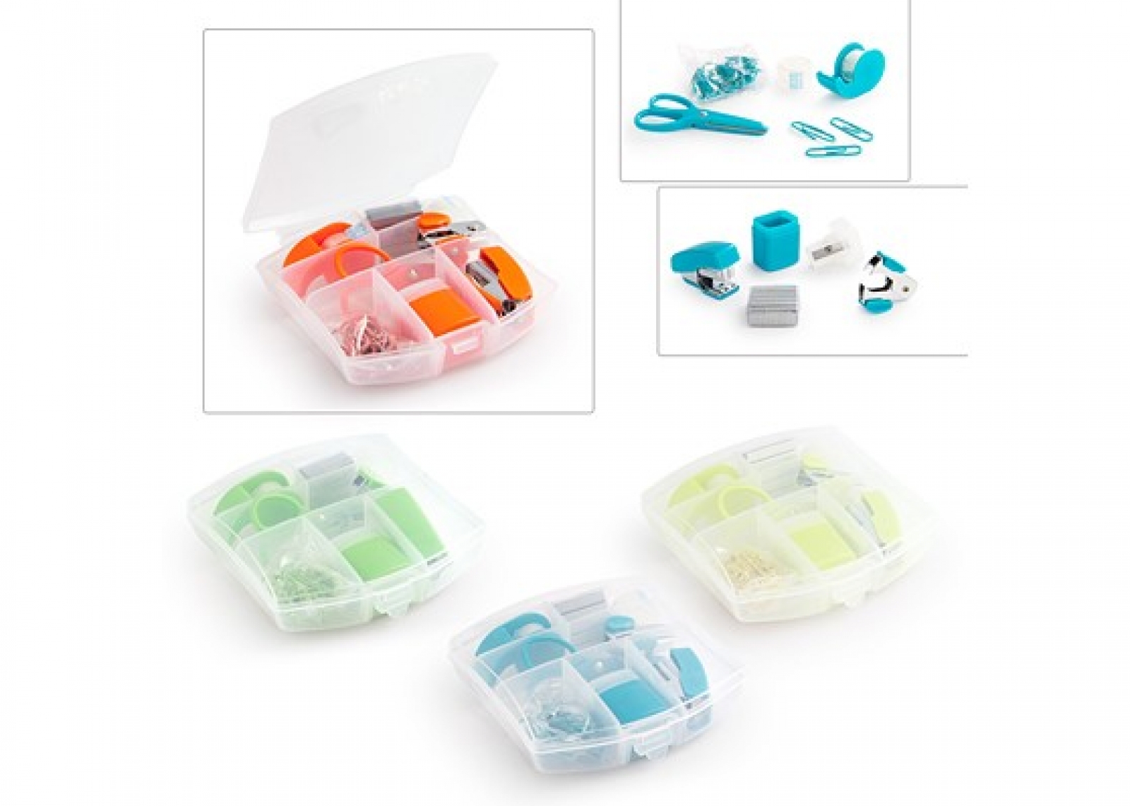 Práctico estuche plástico que contiene 1 una cosedora, ganchos de repuesto x 5, dispensador de cinta adhesiva, rollo de cinta adhesiva de repuesto, clips de colores, saca-ganchos, tijeras, taja-lápiz.