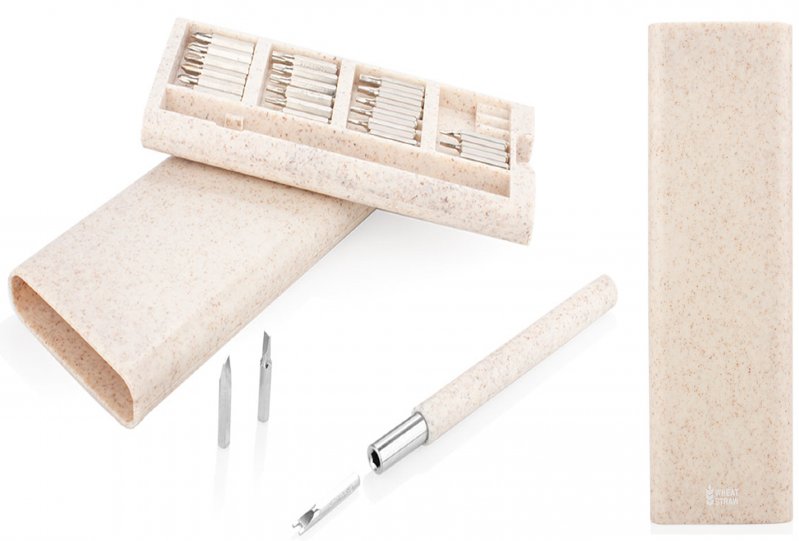 Juego de destornilladores empacado en carcasa de paja de trigo, consta de 24 piezas con tamaños para las diferentes necesidades