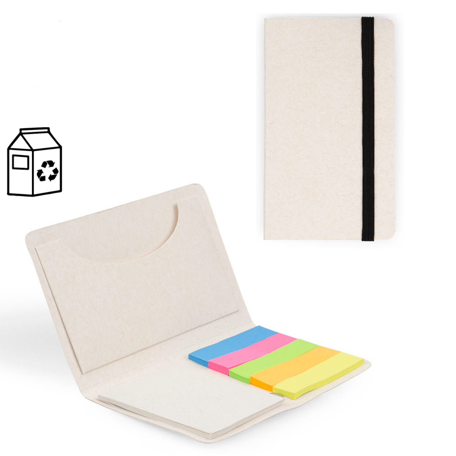 Set de memos elaborados en material recuperado de cajas Tetra pak. Incluye 5 juegos de banderas adhesivas en papel de colores de 25 hojas cada uno, además, tiene espacio para las tarjetas y una banda elástica en el cierre.