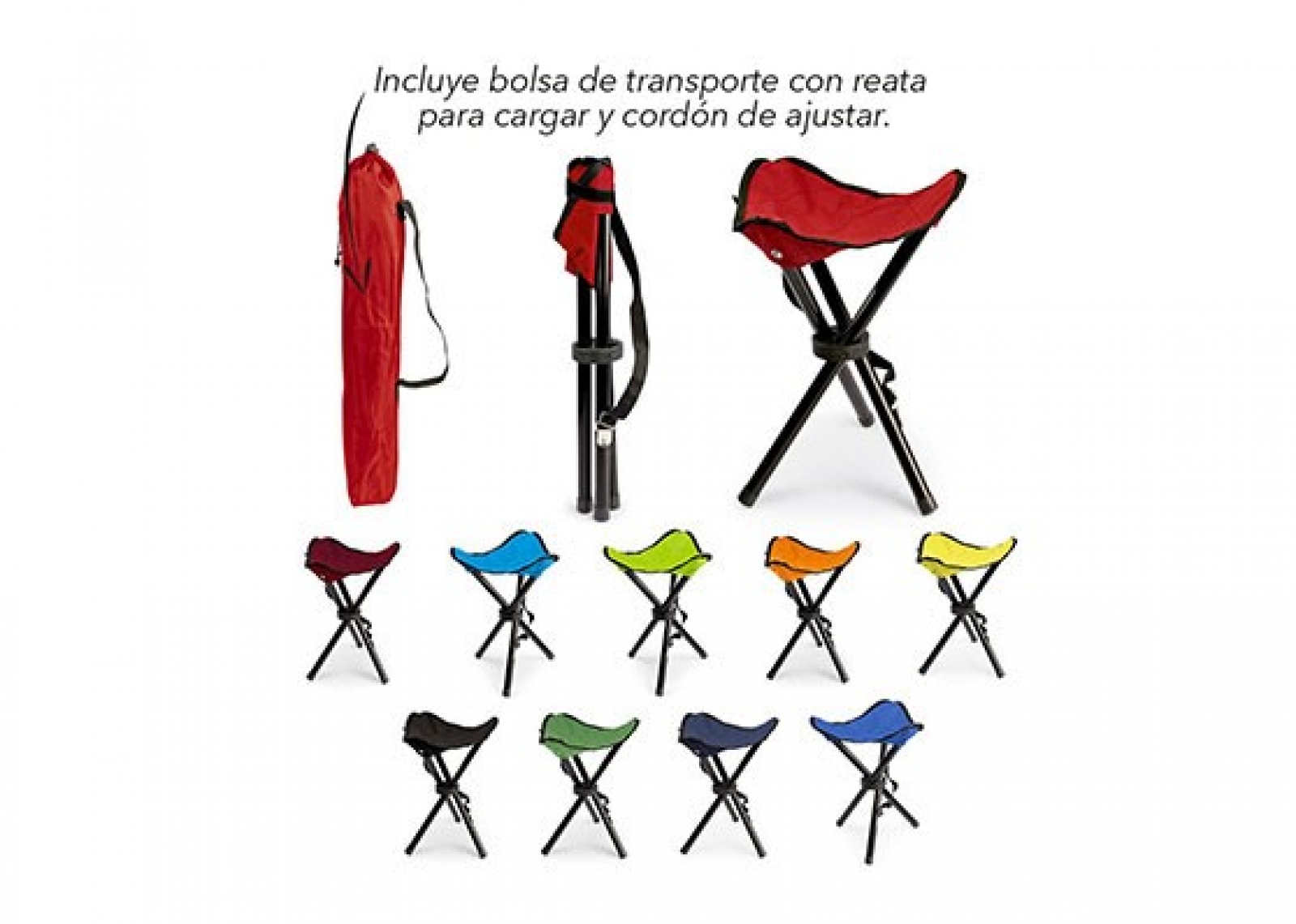 Silla plegable de 3 patas, incluye bolsa de transporte con reata para cargar y cordón de ajustar. Capacidad: Soporta hasta 80 Kg de peso
