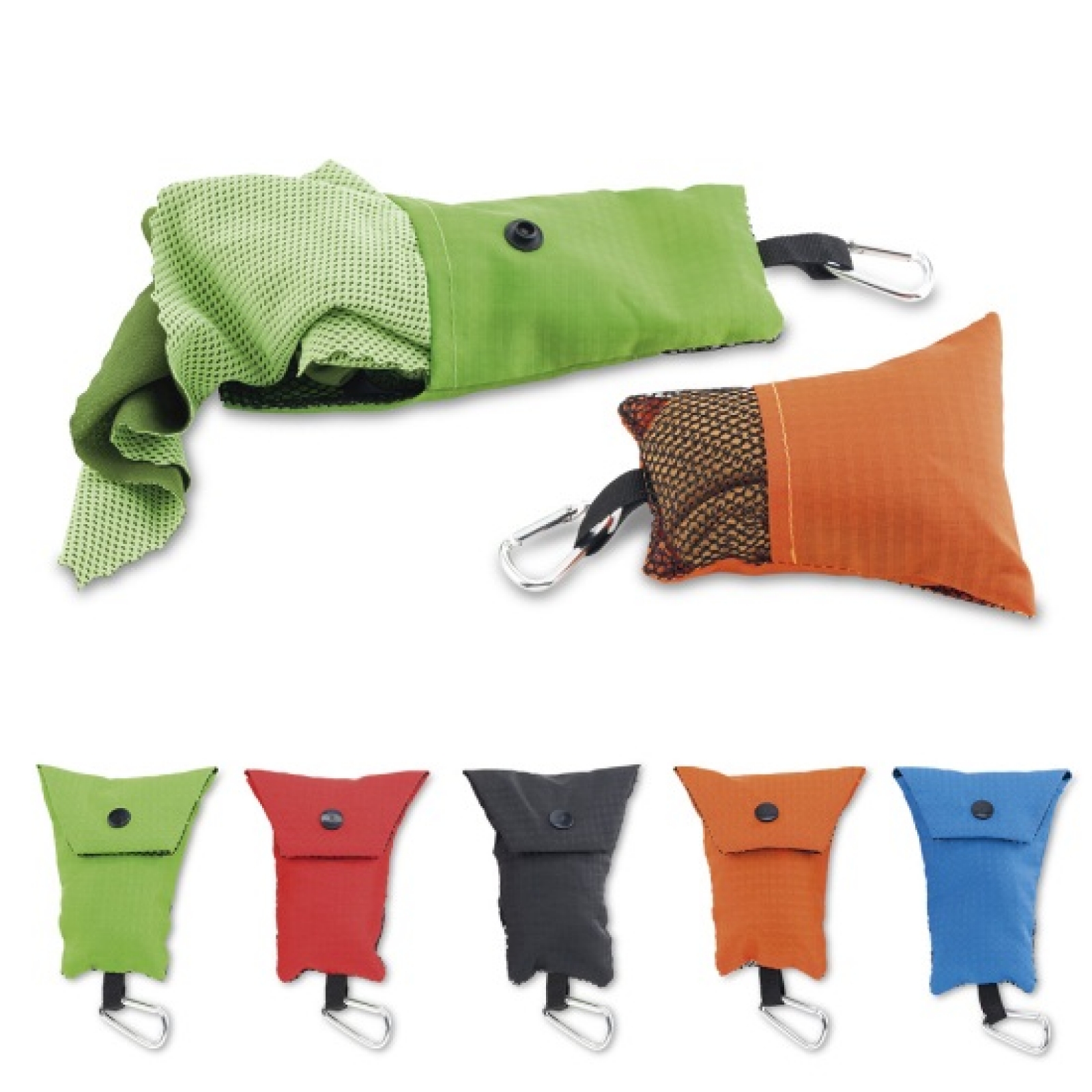 Toalla poliéster con tejido especial que al humedecerse bloquea el agua, manteniendo la temperatura de 3 a 4 horas. Su estructura permite que el agua reduzca la sensación de calor. En estuche de poliéster para cargar