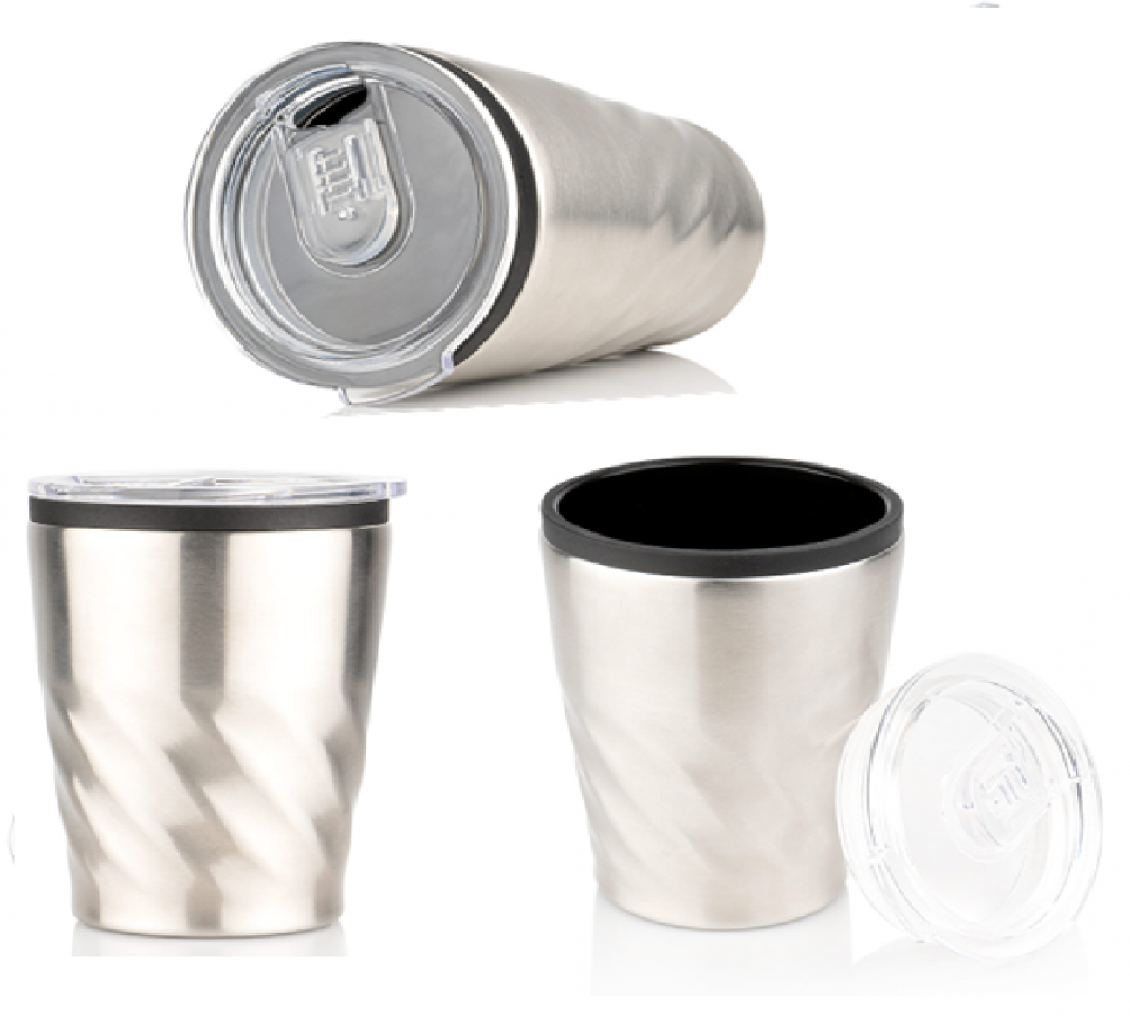 Mug de doble pared, con acero inoxidable en el exterior para un diseño ergonómico y bien estilizado. Interior de Polipropileno. La tapa está hecha de Poliestireno y cuenta con una pequeña seguro de corredera antisalpicaduras. Apto para bebidas frías o calientes, con revestimiento negro y base antideslizante. Libre de BPA. Capacidad de 300 ml (10 oz).